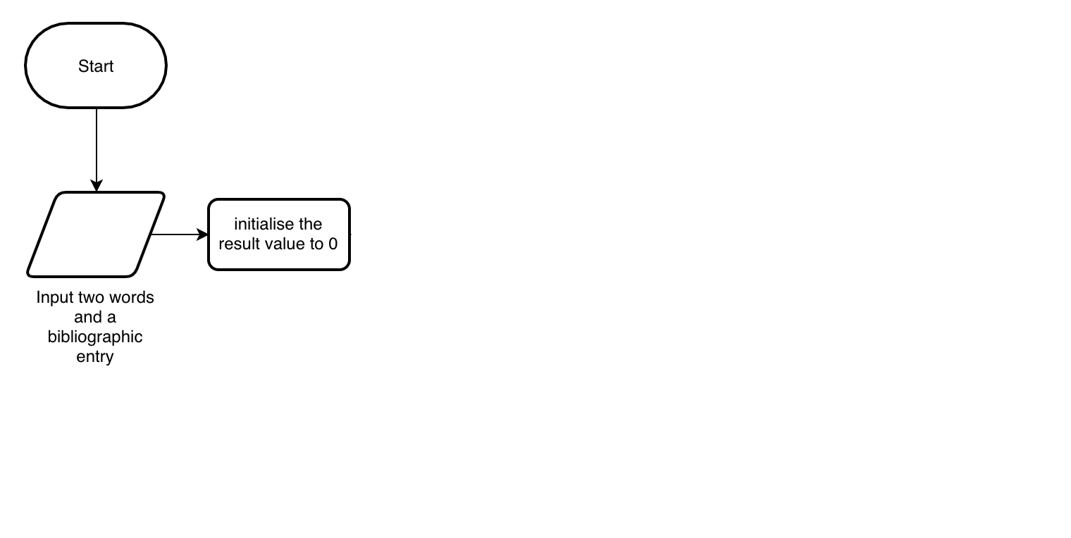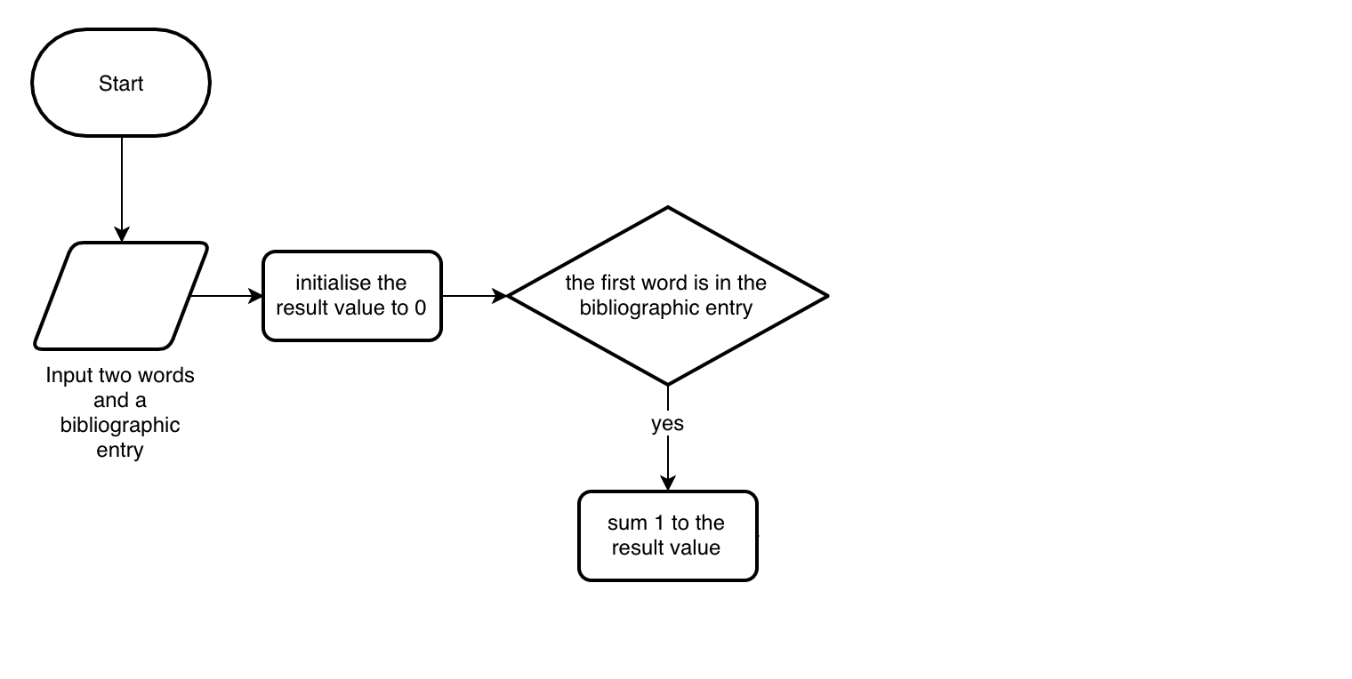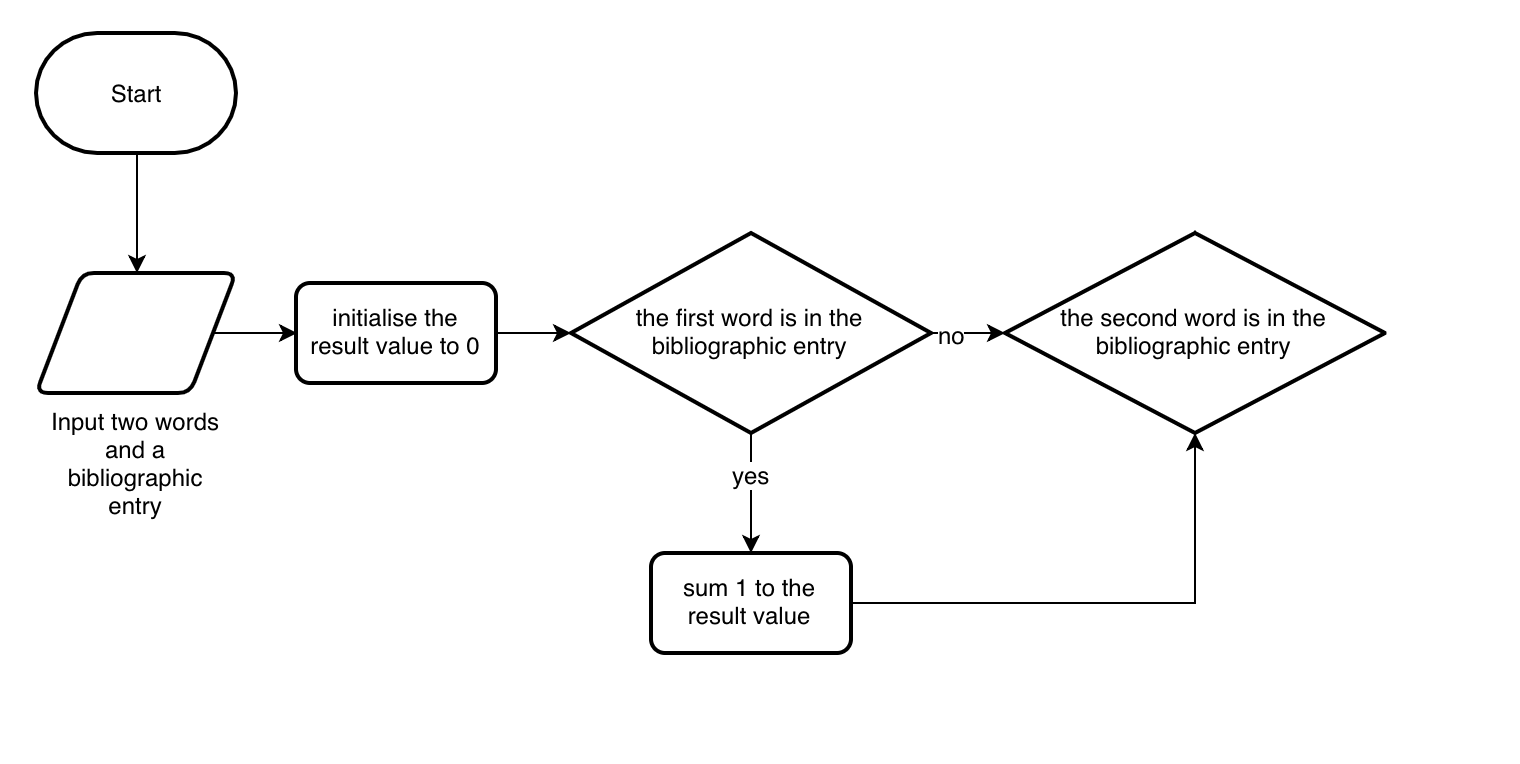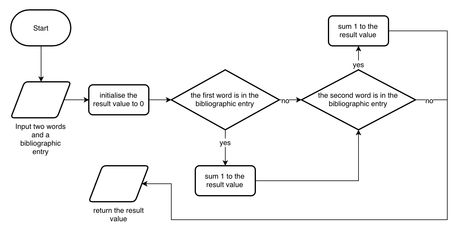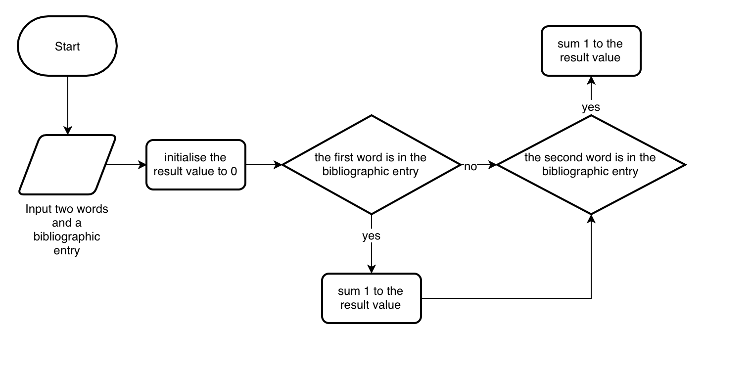 Consider three different strings as input, i.e. two words and a bibliographic entry of a published paper. The algorithm must return: the number 2 if the bibliographic entry contains both words; the number 1 if the bibliographic entry contains only one word; the number 0 otherwise