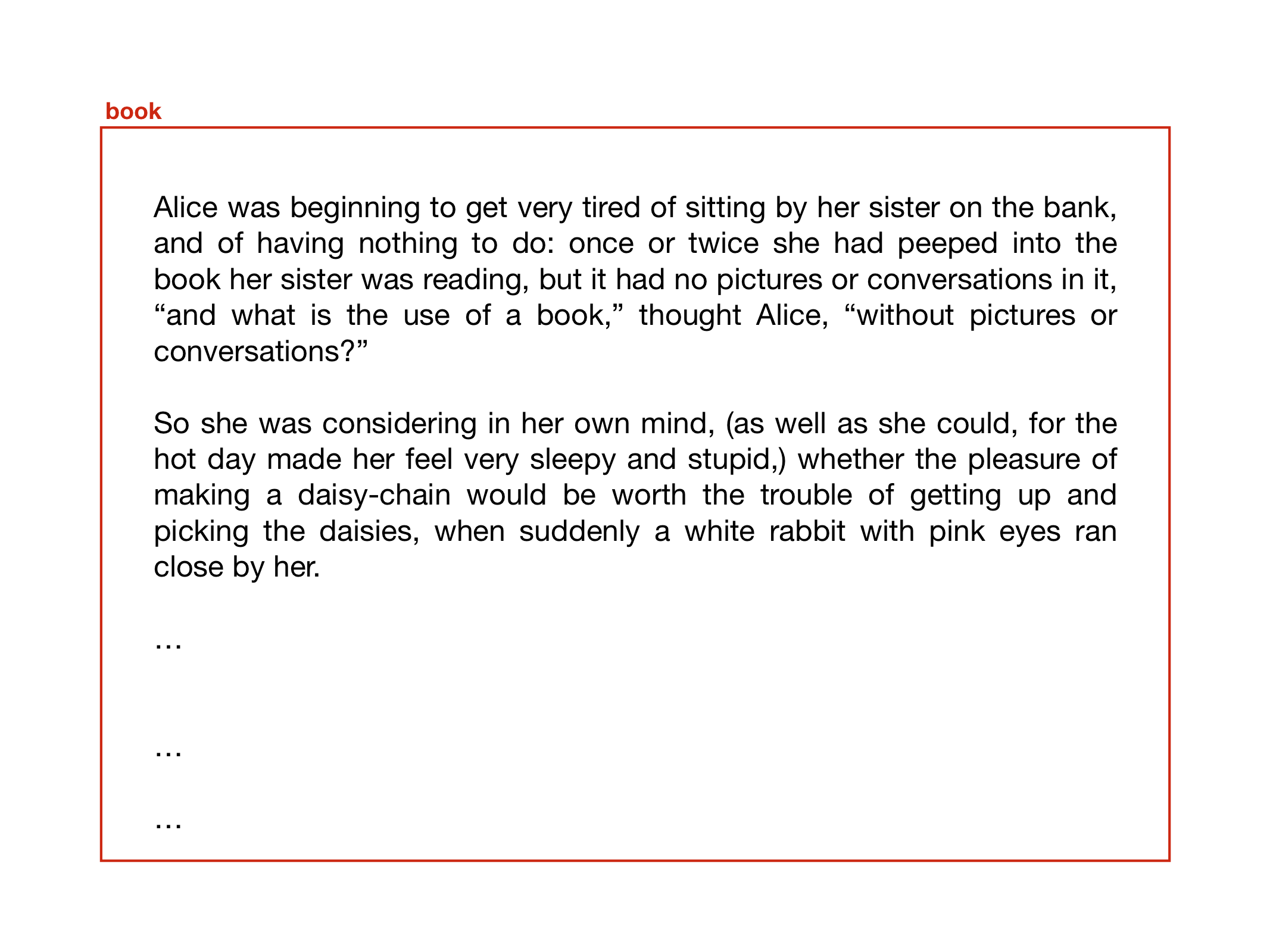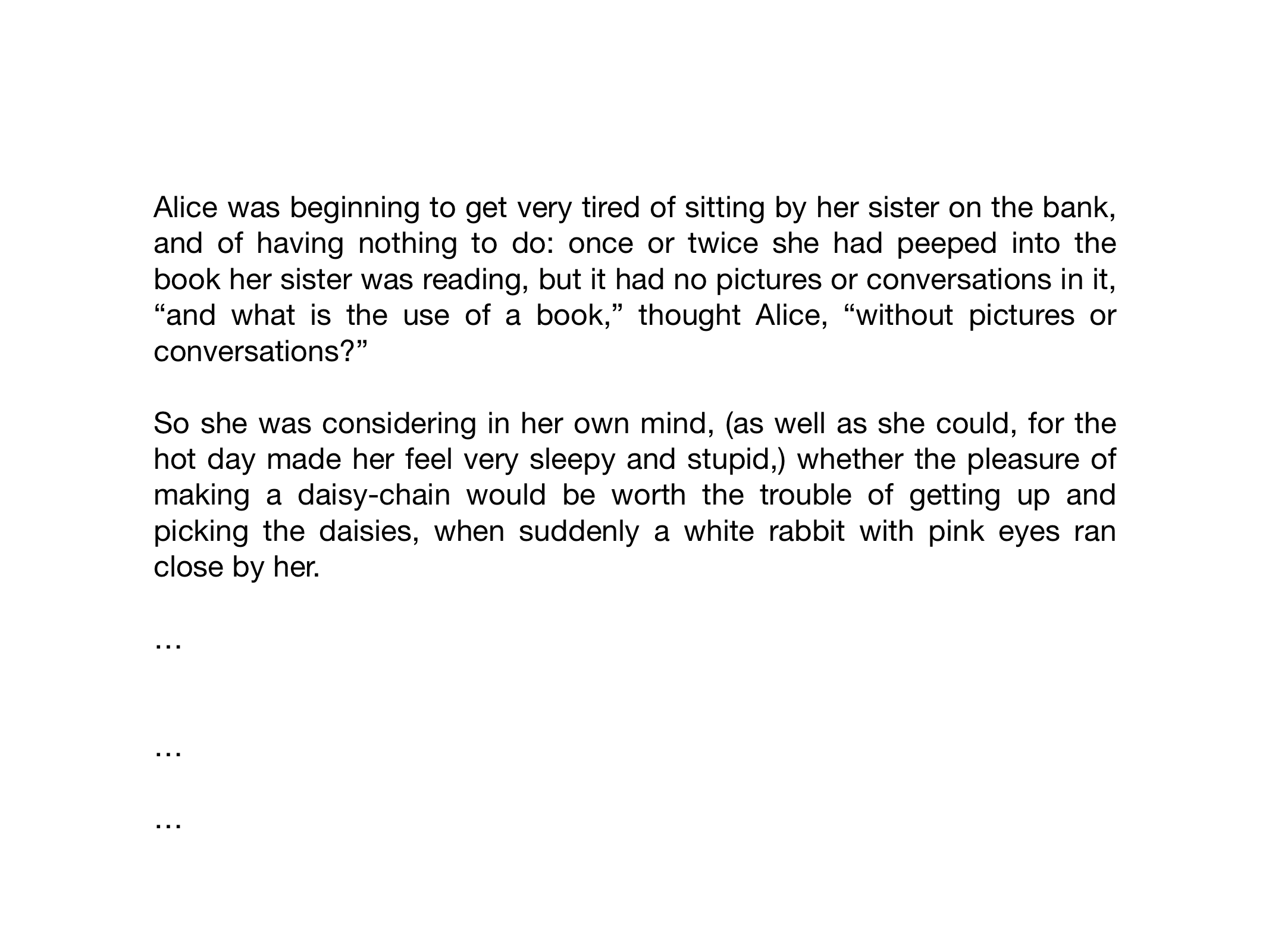 Alice was beginning to get very tired of sitting by her sister on the bank, and of having nothing to do: once or twice she had peeped into the book her sister was reading, but it had no pictures or conversations in it, “and what is the use of a book,” thought Alice, “without pictures or conversations?”