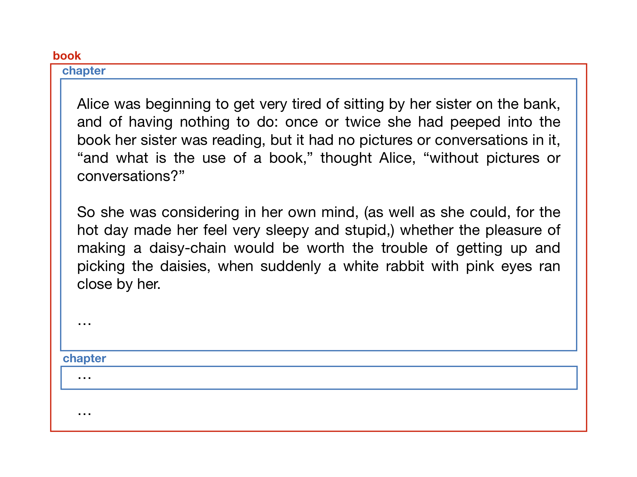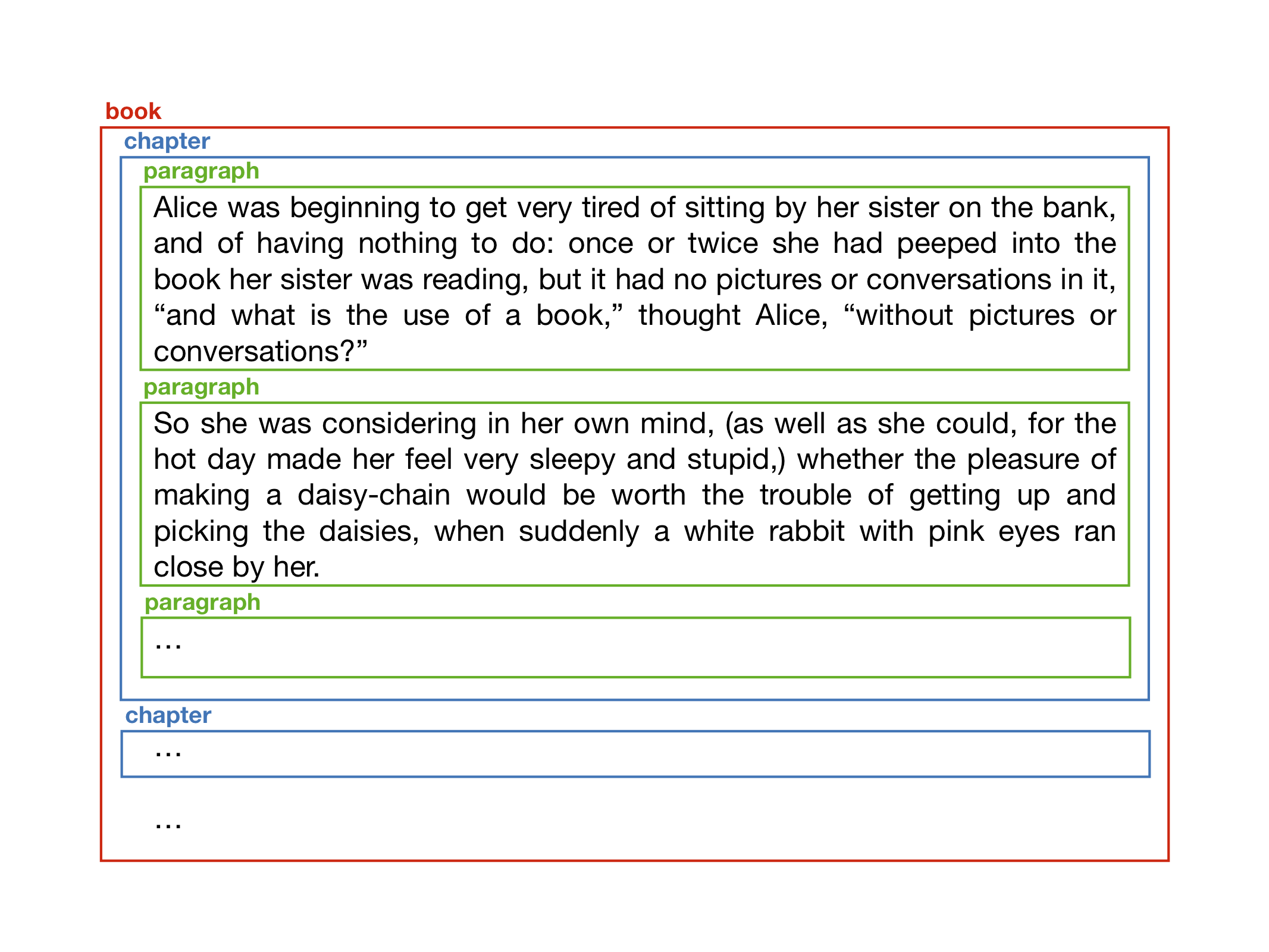 # │ │ ├── Node('/book/chapter/paragraph/Alice was…')